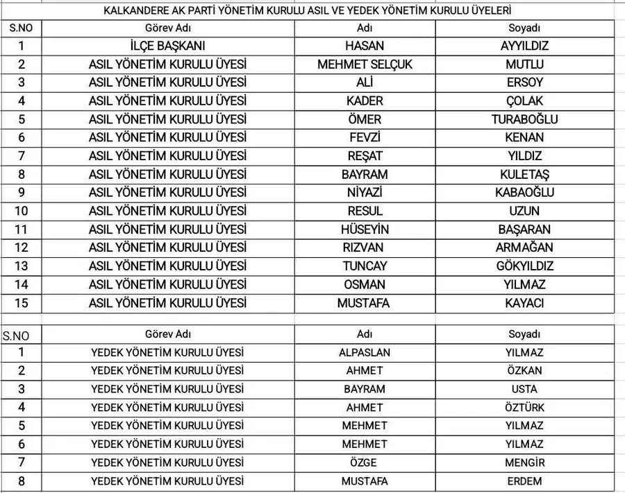 Kalkandere Ak Parti İlçe Yönetim  Kurulu Listesi;