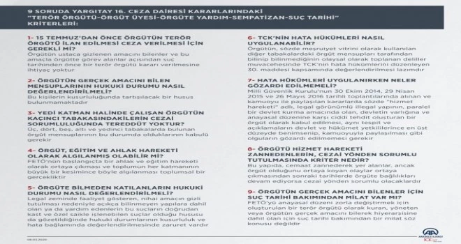 AA muhabirinin derlediği bilgilere göre, Yargıtay 16. Ceza Dairesinin kararlarında, terör örgütü FETÖ'nün kuruluşu, yapısı, işleyişine yer verilirken, üye sayısı, amacı, ekonomik kaynaklarının milletten ve devletten gizli olduğu, örgütün bütün işlemlerinin gizli yürütüldüğü gibi ayrıntılar aktarıldı.
