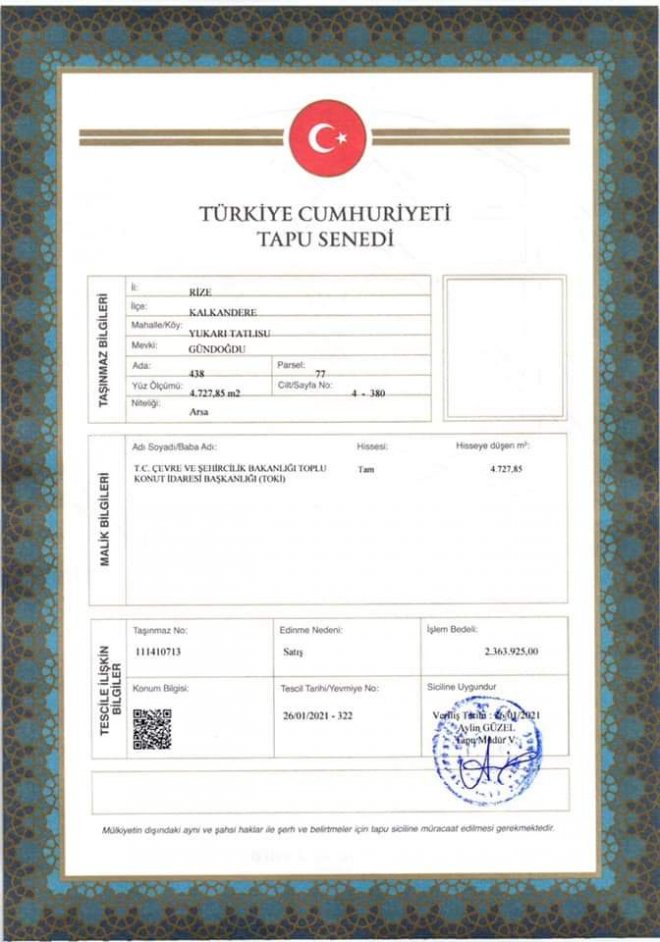 İlçe merkezimizde yapacak olduğumuz TOKİ projemizde Çaykur'a ait arsanın tapusunu almış bulunmaktayız.