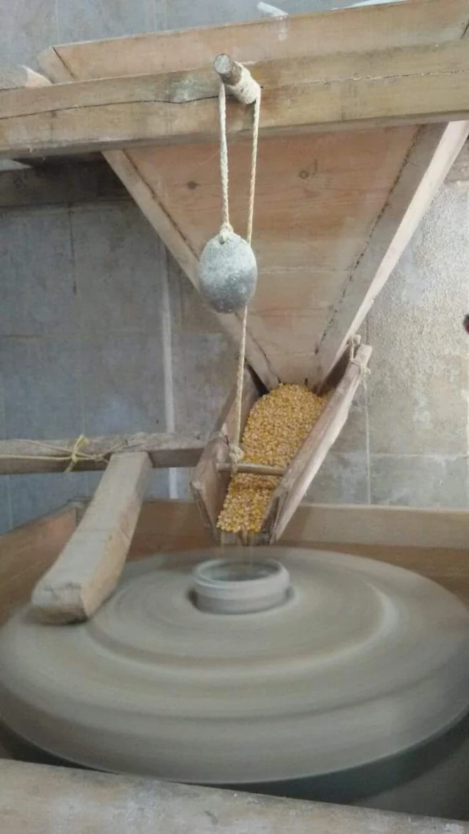 oyulmuş yere tam üstündeki hazneden yavaş yavaş düşen mısırlar, dönen taş tarafından un haline getirirdi.
